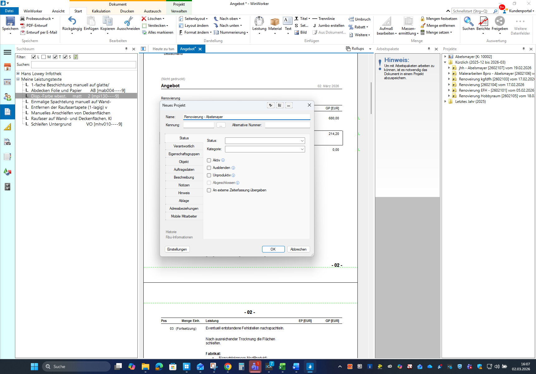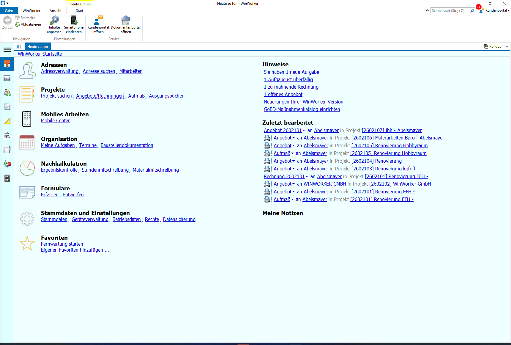 Klicken Sie im Menü *Projekte* auf **Angebot/Rechnung**, um direkt mit der Erstellung Ihres individuellen Angebots zu starten.