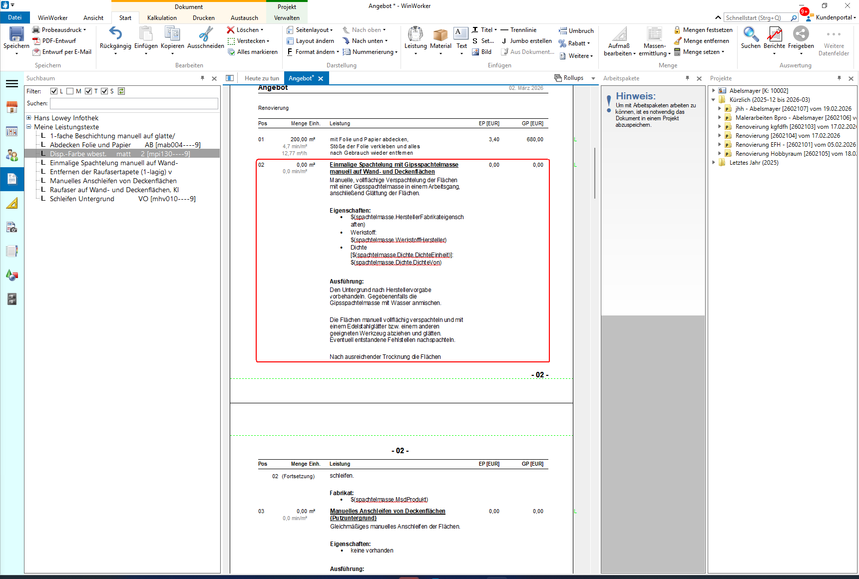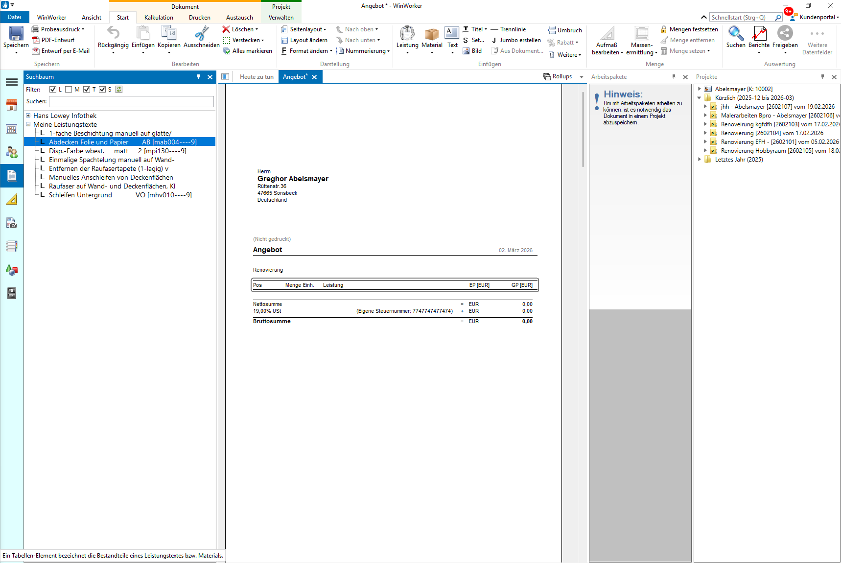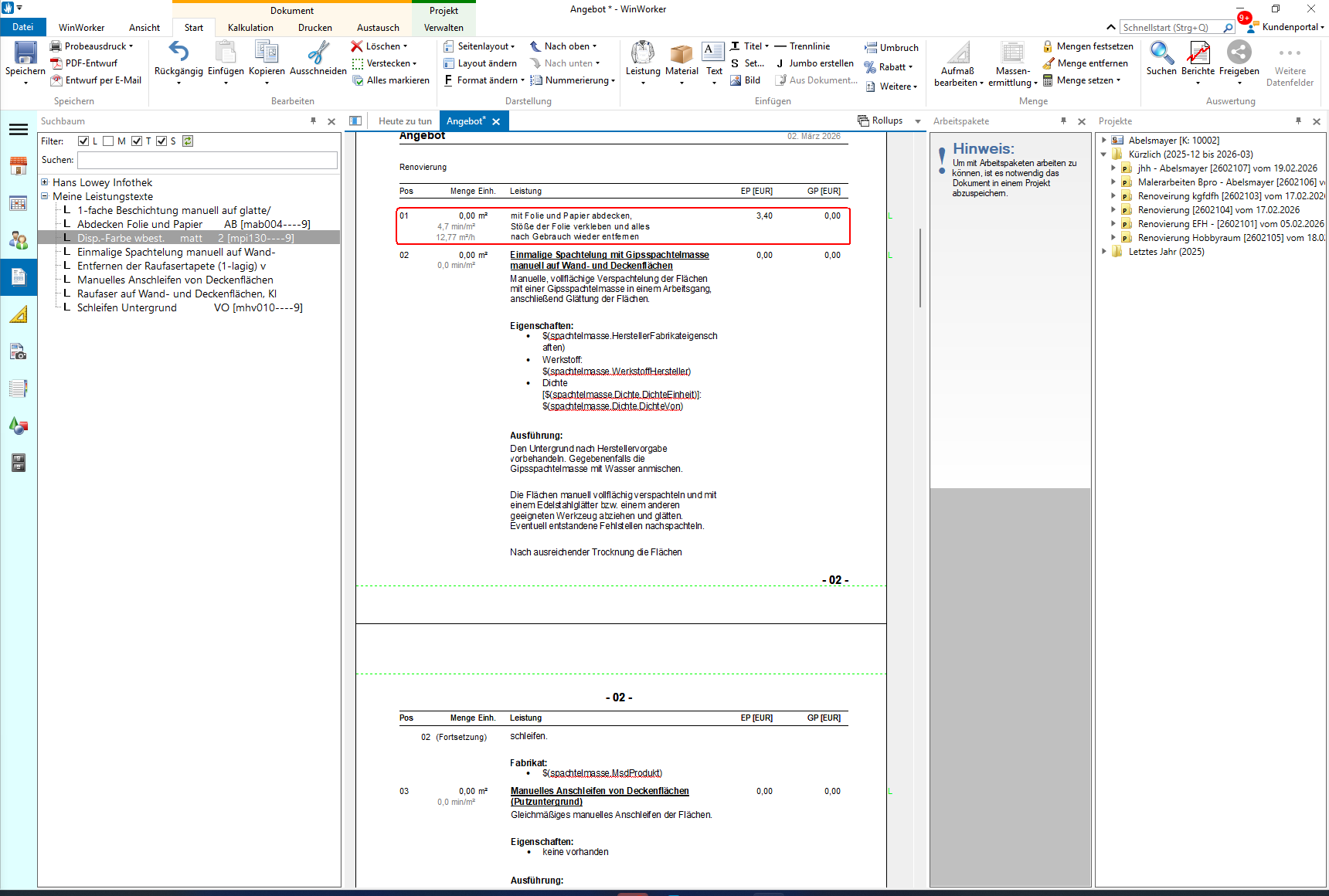Markieren Sie den gewünschten Leistungstext und fügen Sie ihn mit einem Doppelklick in Ihr Angebot ein. Sie einfach den entsprechenden Leistungstext aus markieren ihn und machen einen Doppelklick .