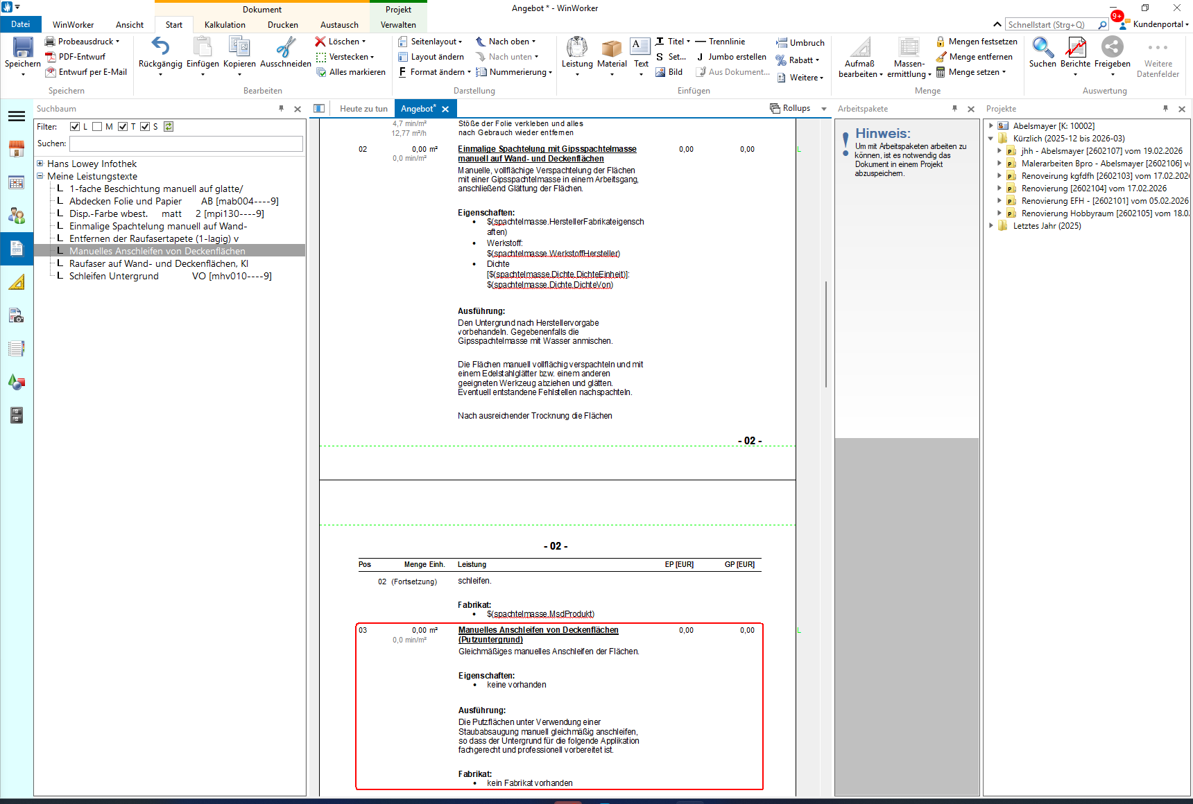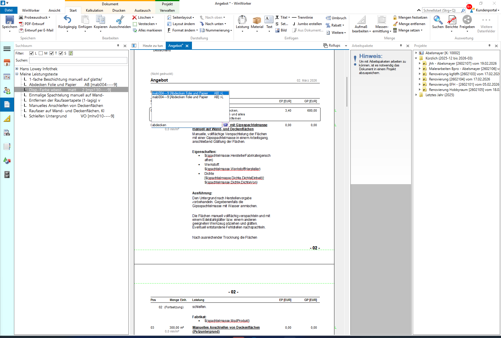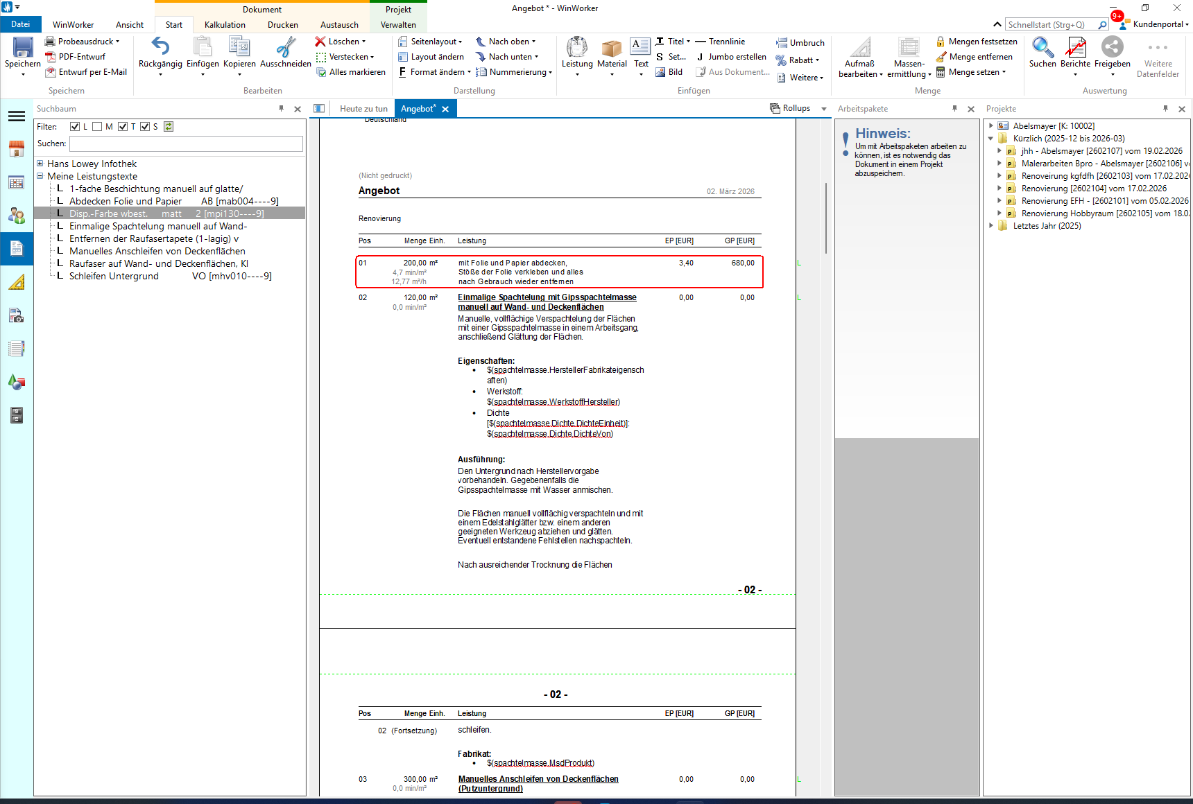 Markieren Sie den gewünschten Leistungstext und fügen Sie ihn mit einem Doppelklick in Ihr Angebot ein. Sie einfach den entsprechenden Leistungstext aus markieren ihn und machen einen Doppelklick .