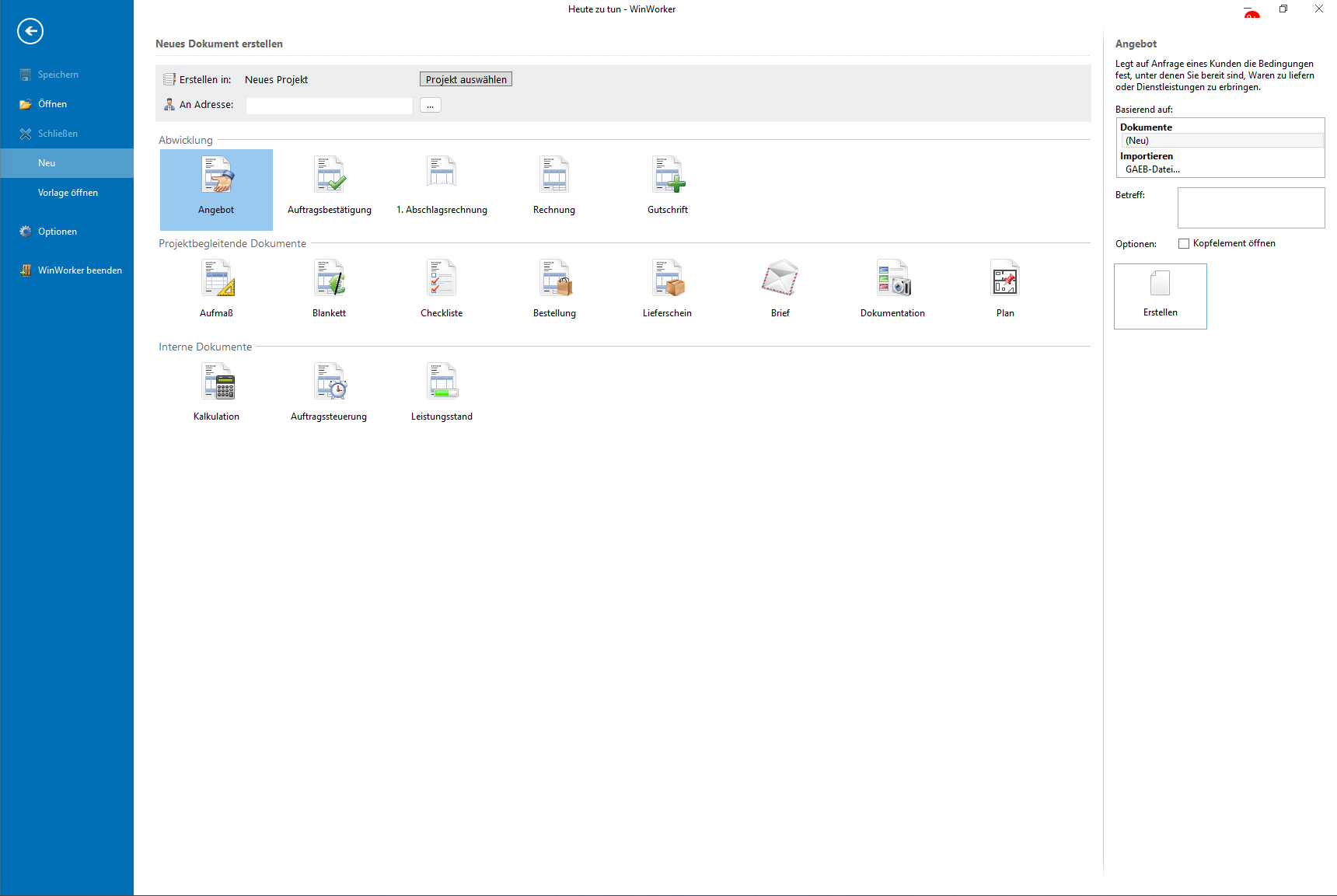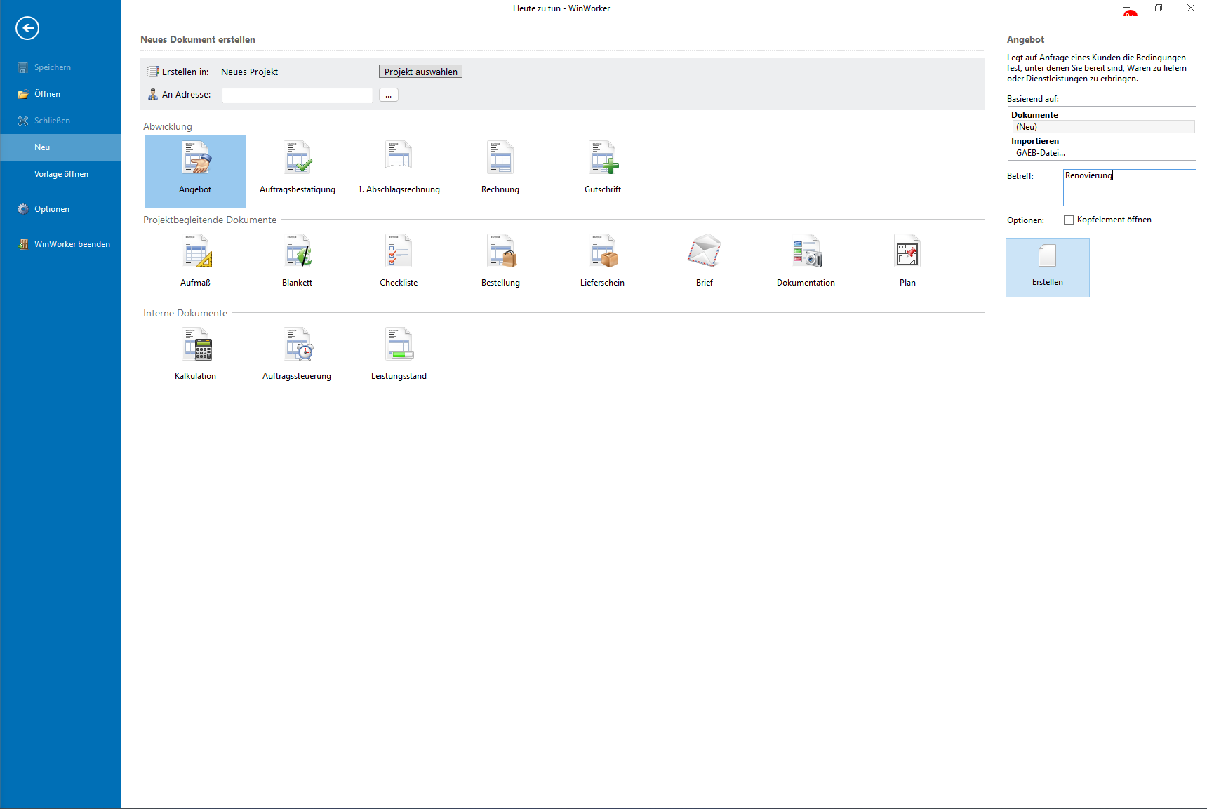 Klicken Sie auf **„Erstellen“**, um Ihr neues Angebotsdokument anzulegen.
