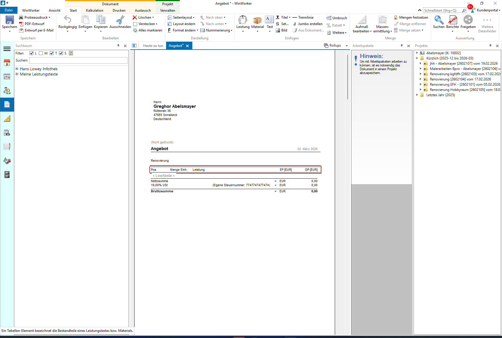 Markieren sie eine beliebige Leistung im Dokument, so dass sich ein roter Rahmen um der Leistung befindet.